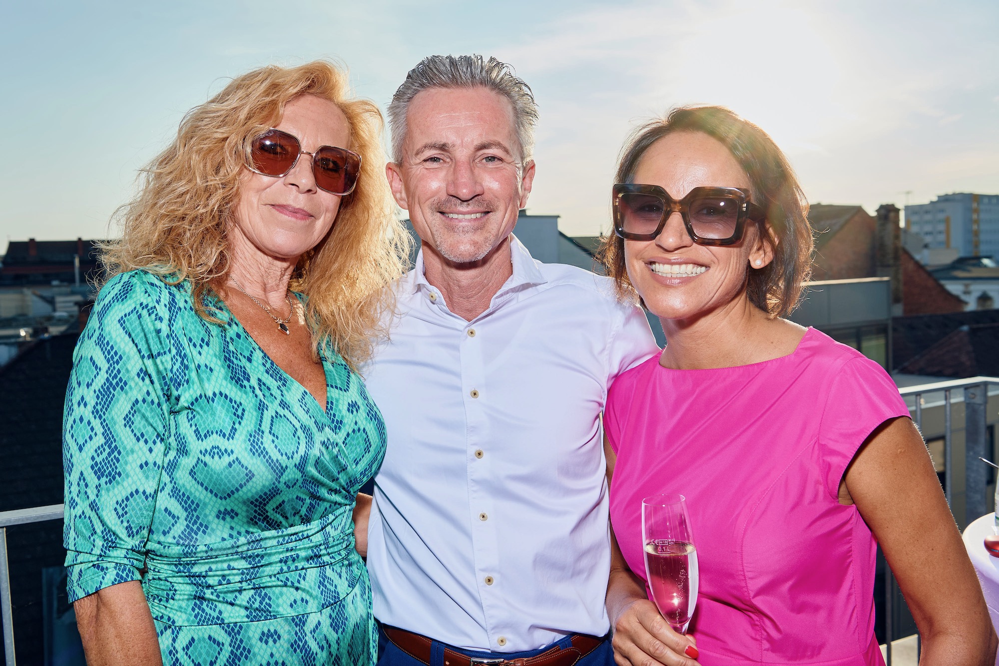 • Auf dem Bild sieht man zwei Frauen mit Sonnenbrillen und einem Herren die in die Kamera lächeln.