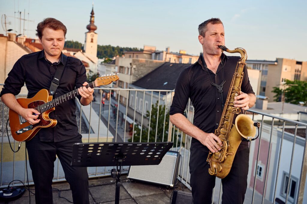 • Auf dem Bild sieht man zwei Musiker die ein Instrument spielen.
